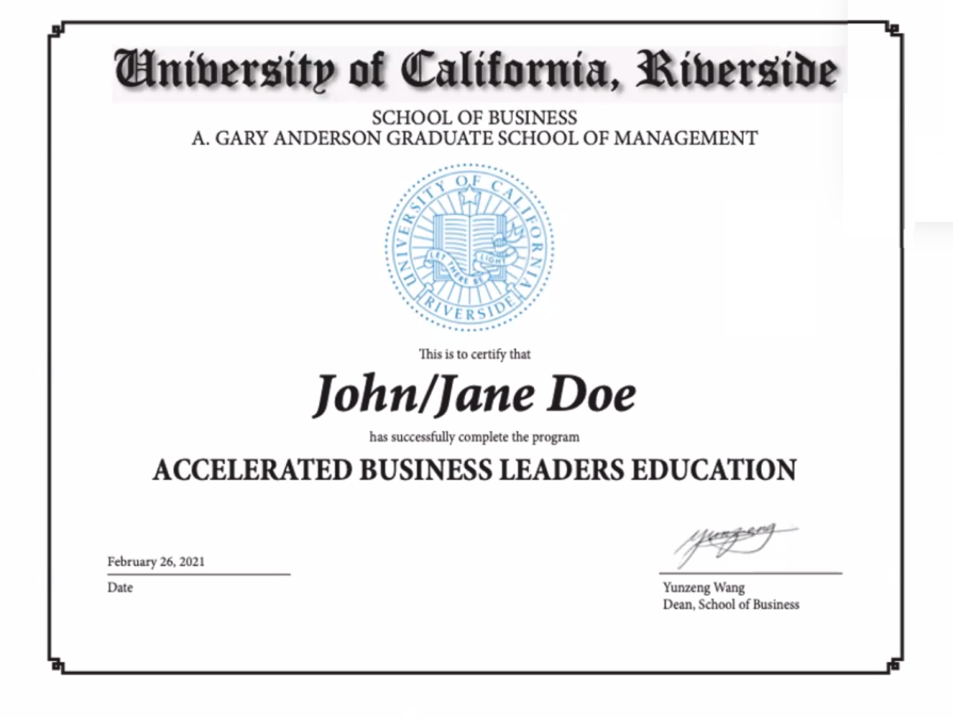完成项目后可获颁学校官方纸质证书,助力未来申研/求职。未来申请UCR研究生可直接免托福并免修MGT404课程。