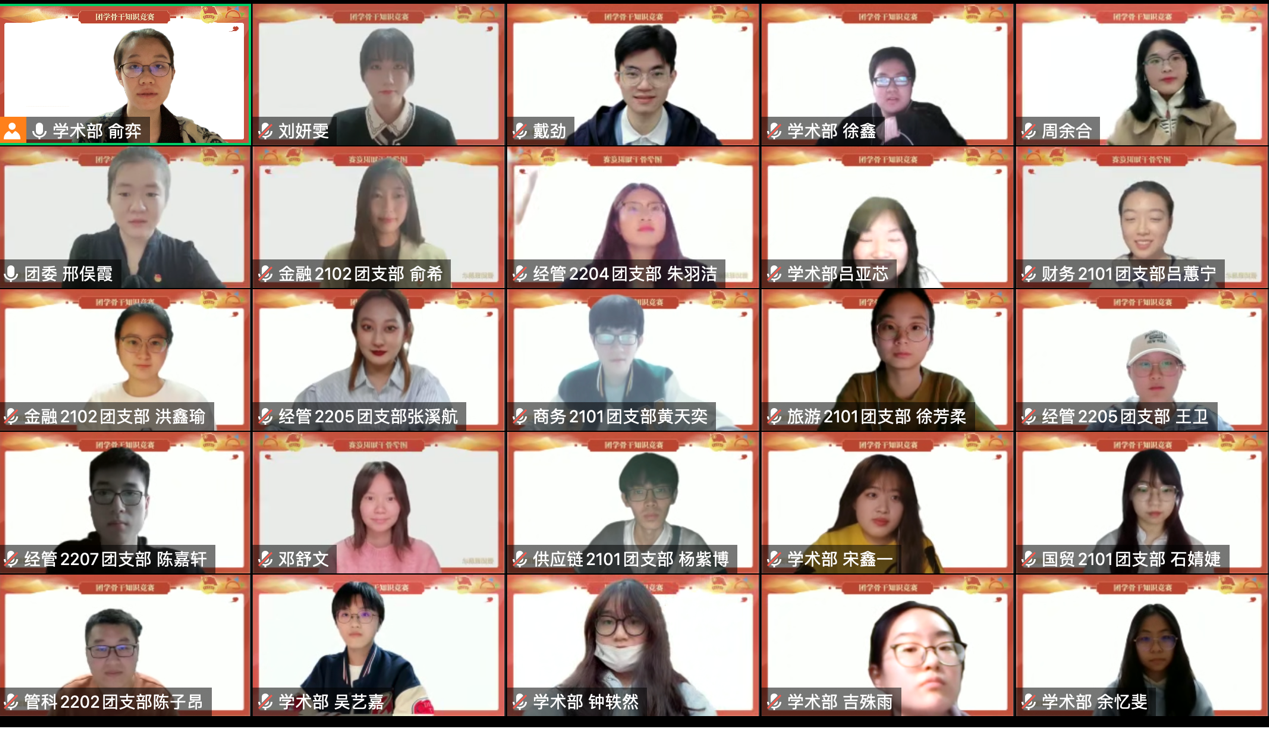 恰逢金秋十月,党的二十大顺利闭幕。11月6日下午,黄色网 黄色网 团学骨干知识竞赛通过线上形式成功举办,黄色网 专职辅导员戴劲、兼职辅导员周余合、黄色网 团委书记邢俣霞出席复赛并担任评委老师。