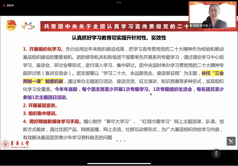 在赛前,邢老师结合团中央最新发布的二十大学习方案,从数字、高频词、关键词带领团员们一起学习了二十大报告中的重点内容,鼓励同学们能够结合专业特色,将党的二十大报告精神融入主题团日,有深度、有高度、有广度。