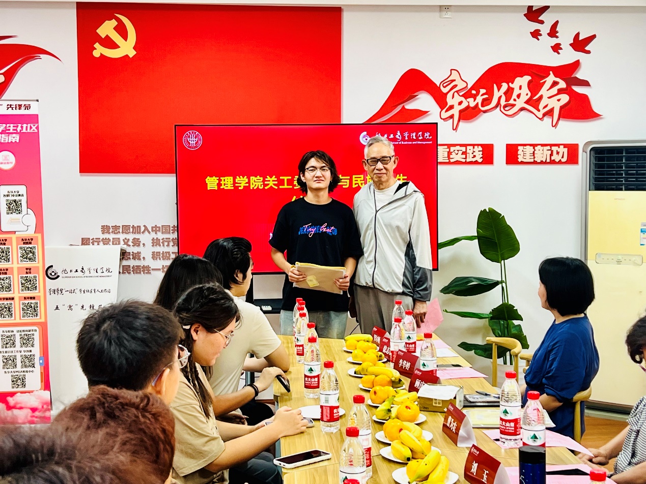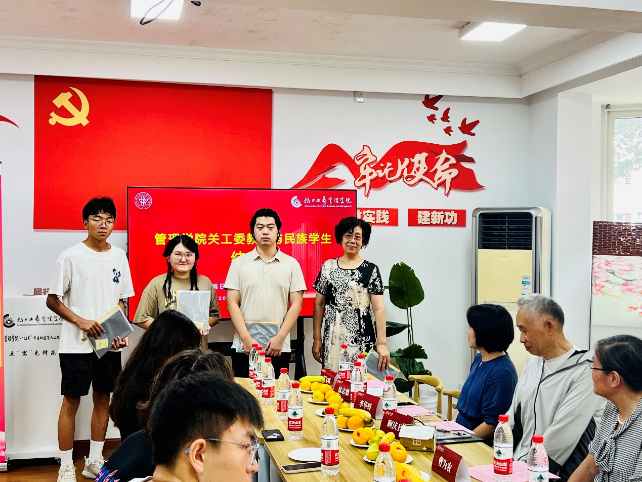 活动中,关工委老师与民族学生及“松柏学子”的结对。大家共进午餐,关工委老师分别与来自不同年级和专业的民族学生、“松柏学子”进行深入交流,了解他们的学习生活状况和个人发展规划,向学生赠“学习加油包”,送上国庆节日的美好祝福。关工委教授们就如何更好地适应大学生活、提升学习成绩等问题与学生们展开了热烈讨论。老教授们结合自身丰富的人生经历和深厚的学术底蕴,鼓励学生们树立远大理想,勇于克服困难,积极参与社会实践,不断拓宽视野,增强就业竞争力。会场气氛活跃而温馨,充满了正能量。这种一对一或一对多的精准结对模式,有效地构建了师生之间的心灵桥梁,让每位学生都能感受到来自学院大家庭的关怀与温暖。