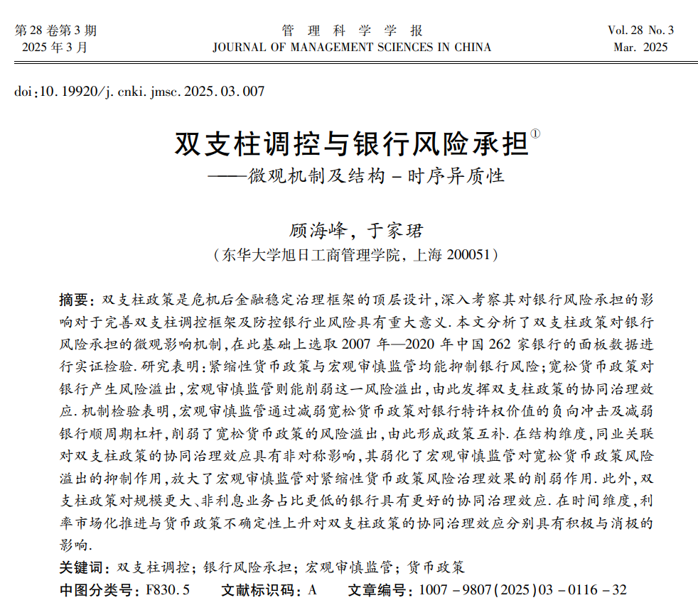 我院应用经济系顾海峰教授以第一作者身份在管理类中文权威期刊《管理科学学报》上发表了学术论文《双支柱调控与银行风险承担——微观机制及结构-时序异质性》(2025年第3期)。