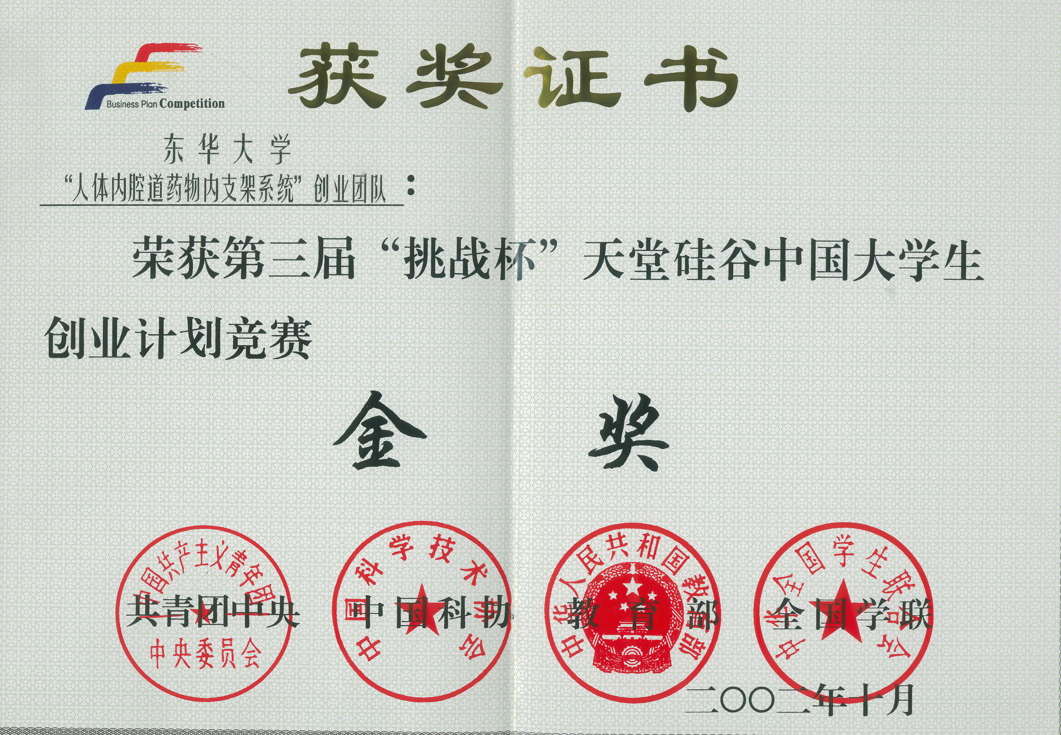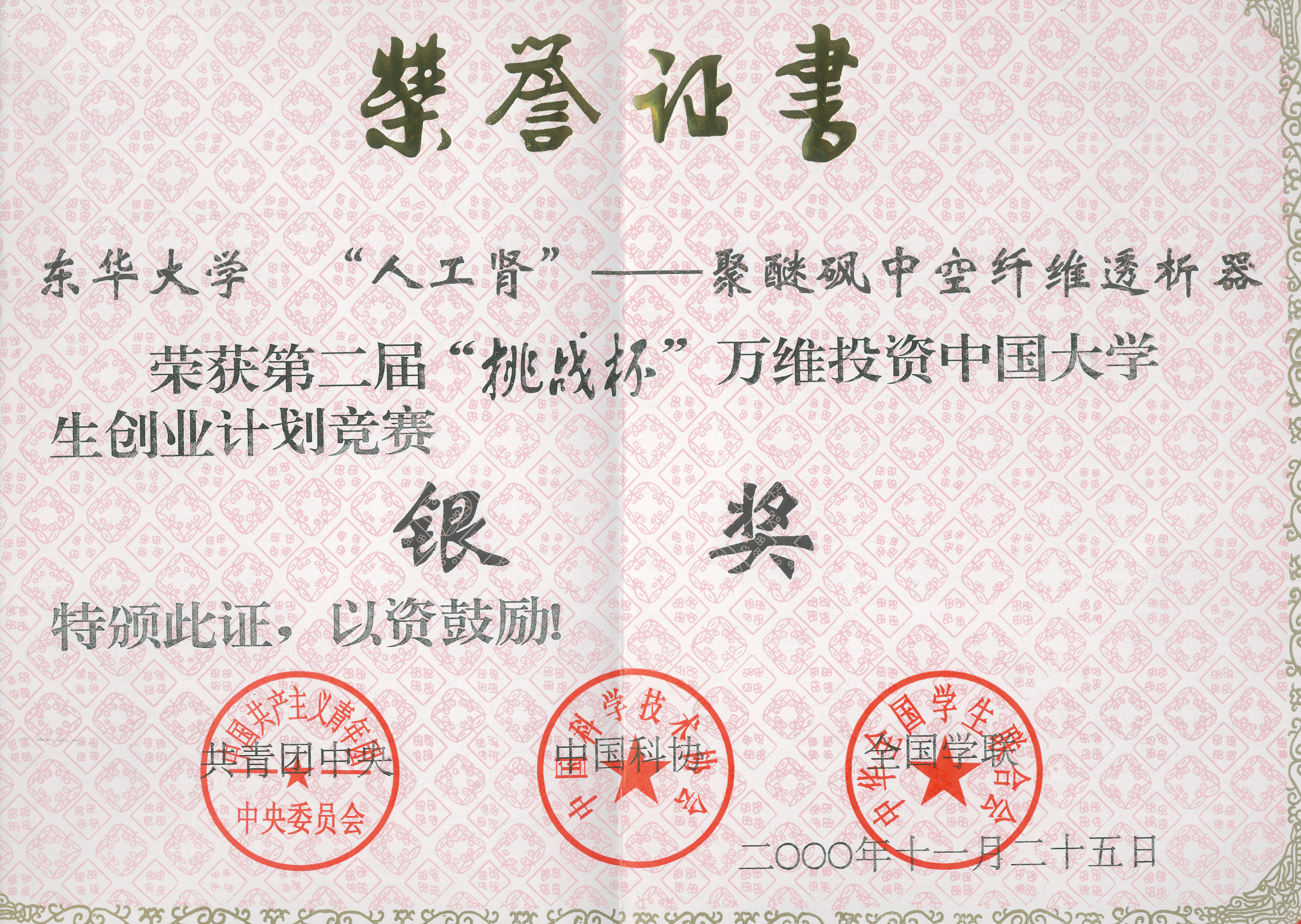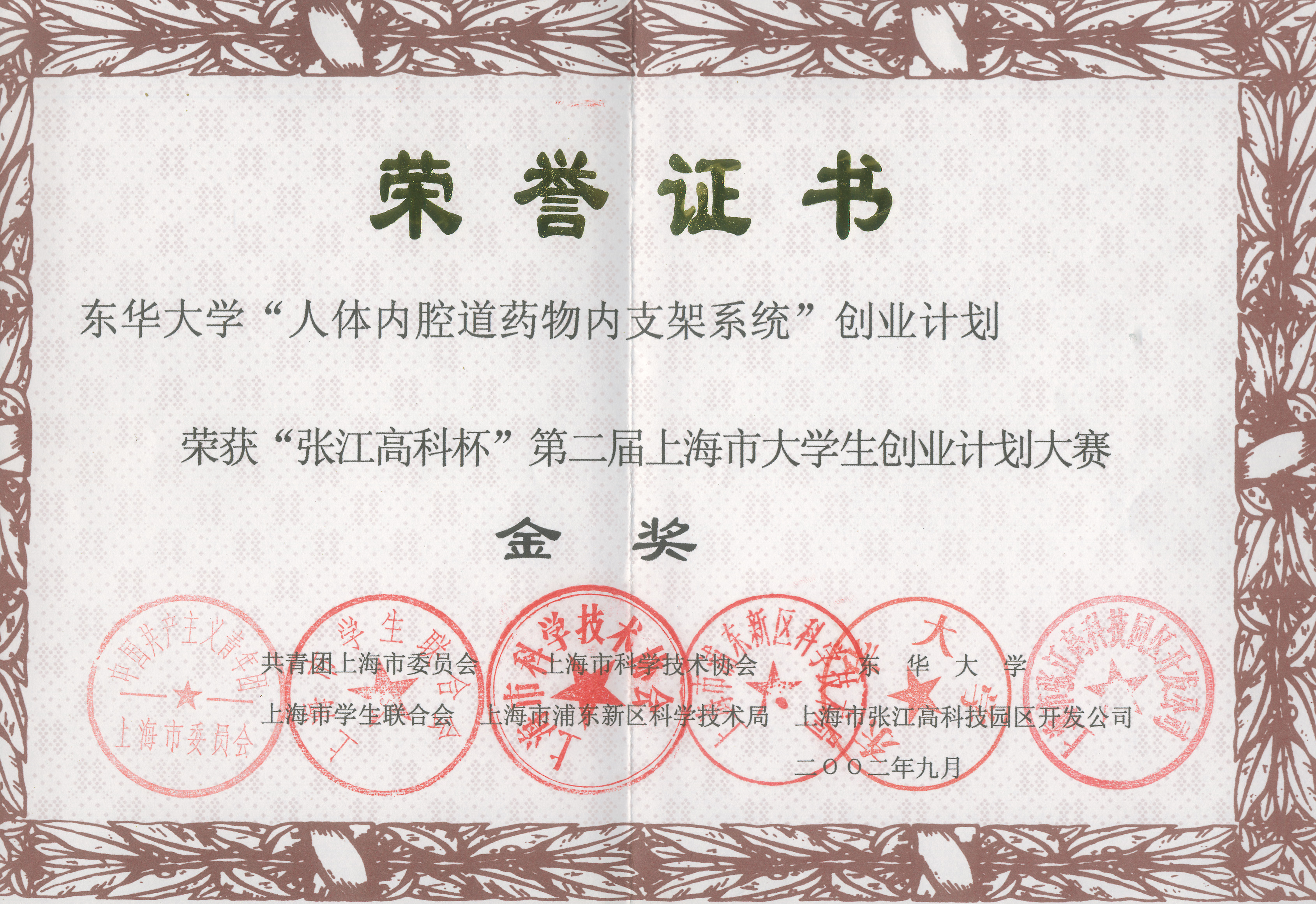 |  | 2003年,侯淼斌等同学的作品《对当前我国地方企业信用体系建设的实证性研究》获得第八届“挑战杯”全国大学生课外学术科技作品竞赛三等奖。 | |  | 2003年,“赛润”医用材料有限公司创业团队荣获“张江高科杯”第二届上海市大学生创业计划大赛银奖。 | |  | 2002年,赛润医用材料有限公司创业团队荣获第三届“挑战杯”天堂硅谷中国大学生创业计划竞赛铜奖。 | |  | 2002年,绿源草坪有限公司创业团队荣获第三届“挑战杯”天堂硅谷中国大学生创业计划竞赛金奖。 | |  | 2002年,“绿源草坪有限公司创业团队”荣获“张江高科杯”第二届上海市大学生创业计划大赛铜奖。 | |  | 2002年,人体内腔道药物内支架系统创业团队荣获第三届“挑战杯”天堂硅谷中国大学生创业计划竞赛最佳表现团队奖。 | |  | 2002年,“人体内腔道药物内支架系统”创业团队荣获第三届“挑战杯”天堂硅谷中国大学生创业计划竞赛金奖。 | |  | 2002年,“人体内腔道药物内支架系统”创业计划荣获“张江高科杯”第二届上海市大学生创业计划大赛金奖。 | |  | 2000年,“人工肾”——聚醚砜中空纤维透析器荣获第二届“挑战杯”万维投资中国大学生创业计划竞赛银奖。 | |  | 2000年,富光绿色照明有限责任公司(团队)荣获“张江杯”上海市大学生创业计划大赛金奖。 | |  | 2000年,熔融法生产PAN基碳纤维(团队)荣获“张江杯”上海市大学生创业计划大赛银奖。 | |  | 2000年,熔融法生产PAN基碳纤维荣获第二届“挑战杯”万维投资中国大学生创业计划竞赛银奖。 |